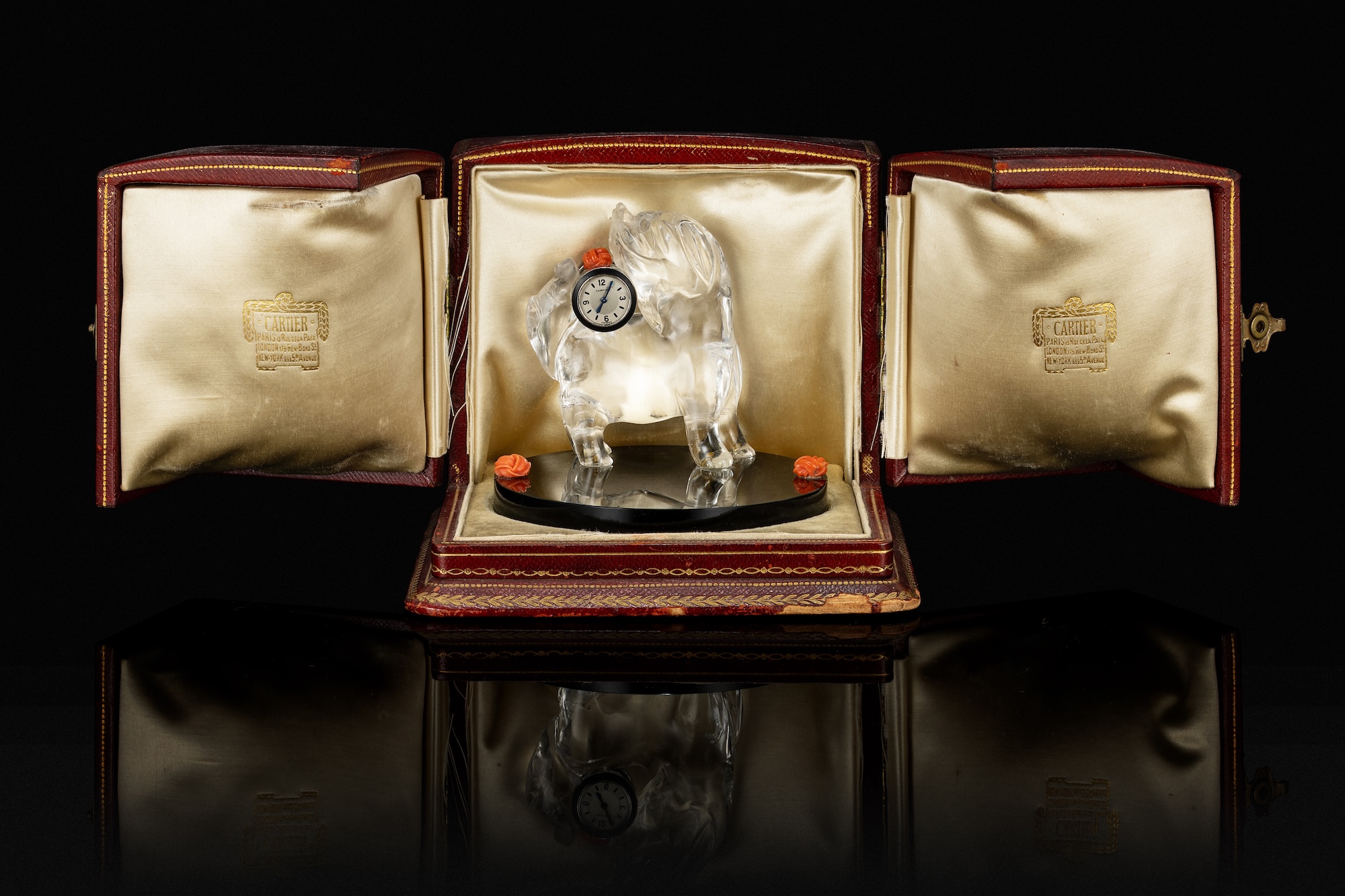 Set with a rock crystal foo dog carving on a circular onyx base, highlighted with three coral Chinese knots. Circular dial with Arabic numerals and blued steel hands. Signed Cartier, numbered C1113 and 78285. Mechanical movement, with original fitted case, circa 1920.