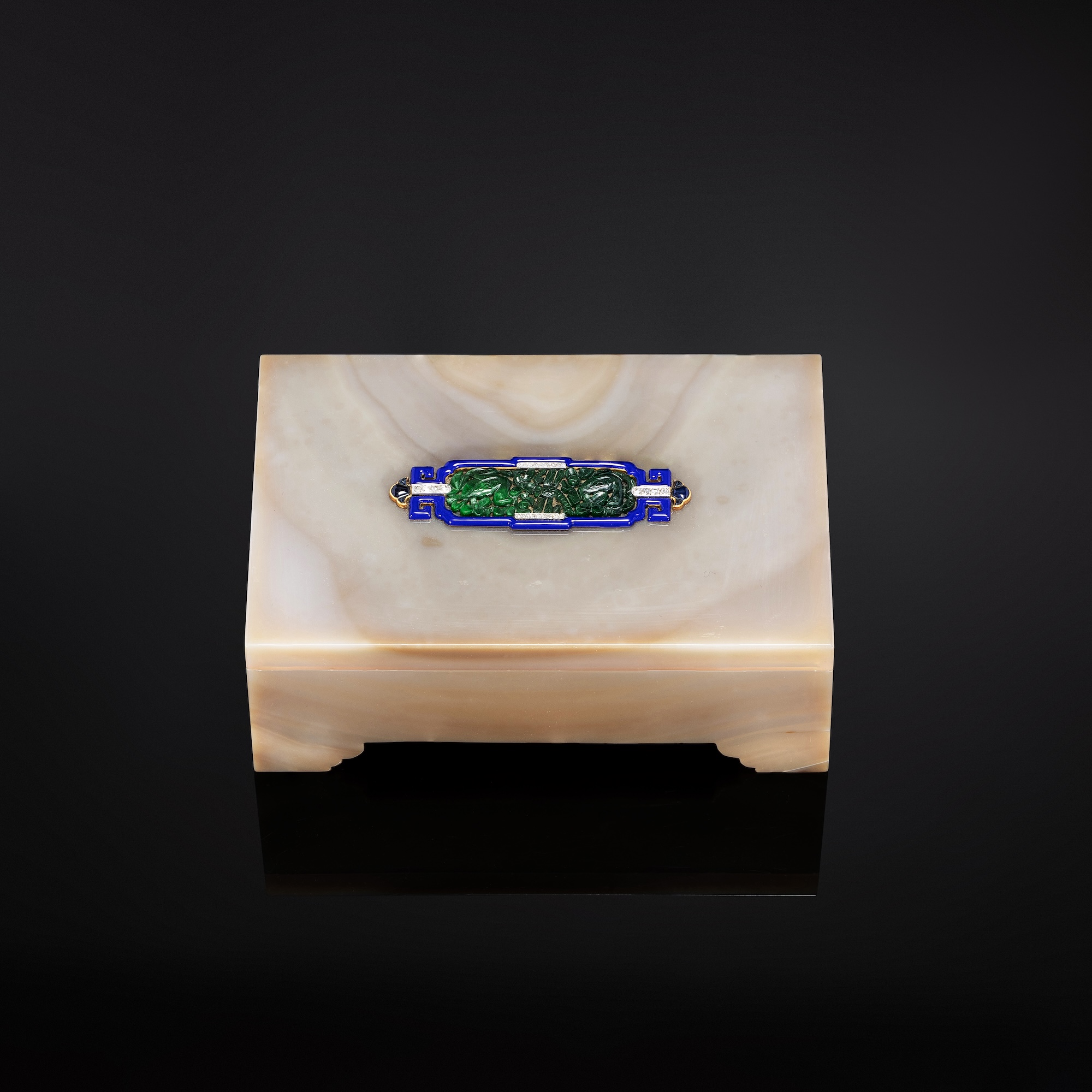 The rectangular box carved in agate, topped by a removable lid embellished with a carved nephrite depicting a pair of birds and dragonfly, within a blue enamel frame, accented with rose-cut diamonds and buff-top sapphires. Signed Cartier, Made in France, with French maker's mark (indistinct).