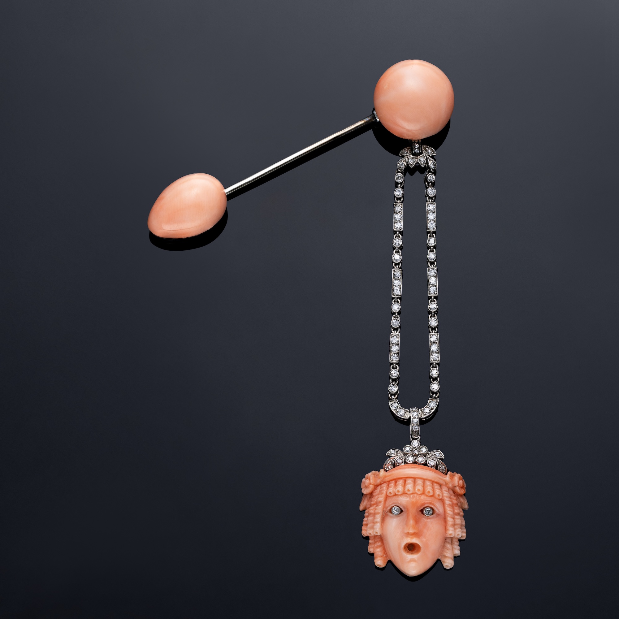 Set with a button shaped coral, suspending a hoop of single- cut diamonds in millegrain setting, terminating in a carved coral Greek mask with diamond eyes, to the diamond foliate surmount; the keeper set with a pear-shaped cabochon coral, mounted in platinum. Signed Cartier, numbered 2419223, with Cartier fitted case, circa 1926.