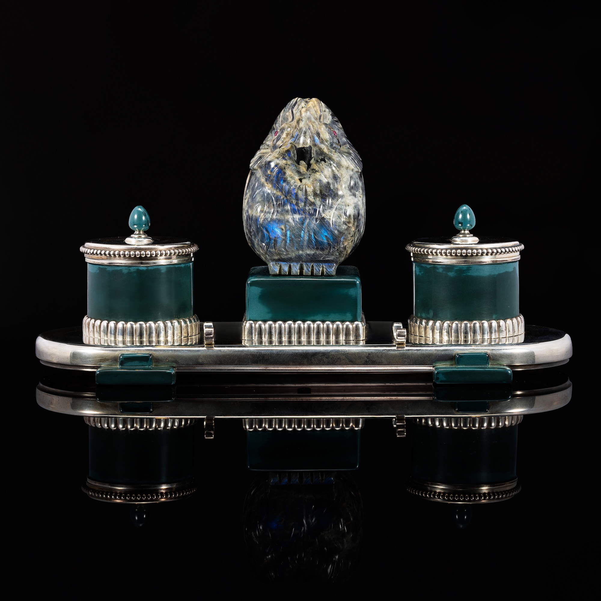 Modelled as a carved hardstone owl, set with ruby eyes, flanked by two cylindrical inkwells with silver hinged lid and fluted border, decorated with green enamel, with a pen tray incorporated in the base between the inkstands, mounted in silver. Signed Cartier, Made in France.