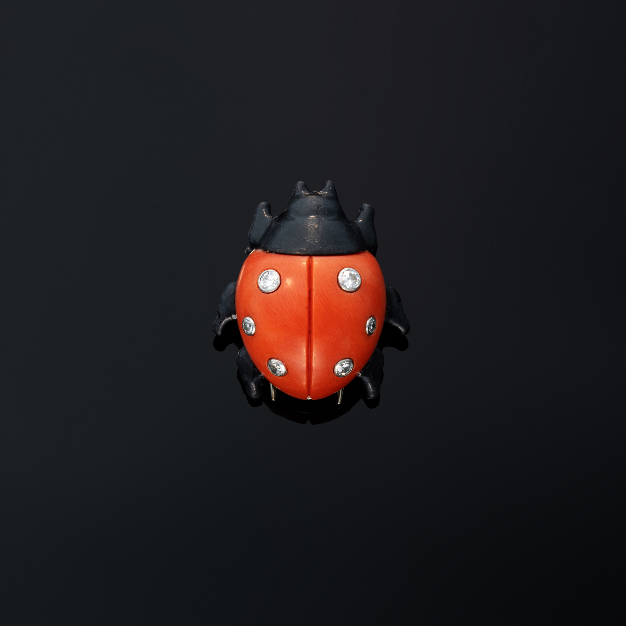 Designed as a ladybug, the carved coral body highlighted with bezel-set circular-cut diamonds, the head and legs applied with black enamel, mounted in platinum and 18k white gold. Signed Cartier Paris, with French assay marks for platinum and gold, and maker's mark for Cartier, numbered 012221, circa 1960.