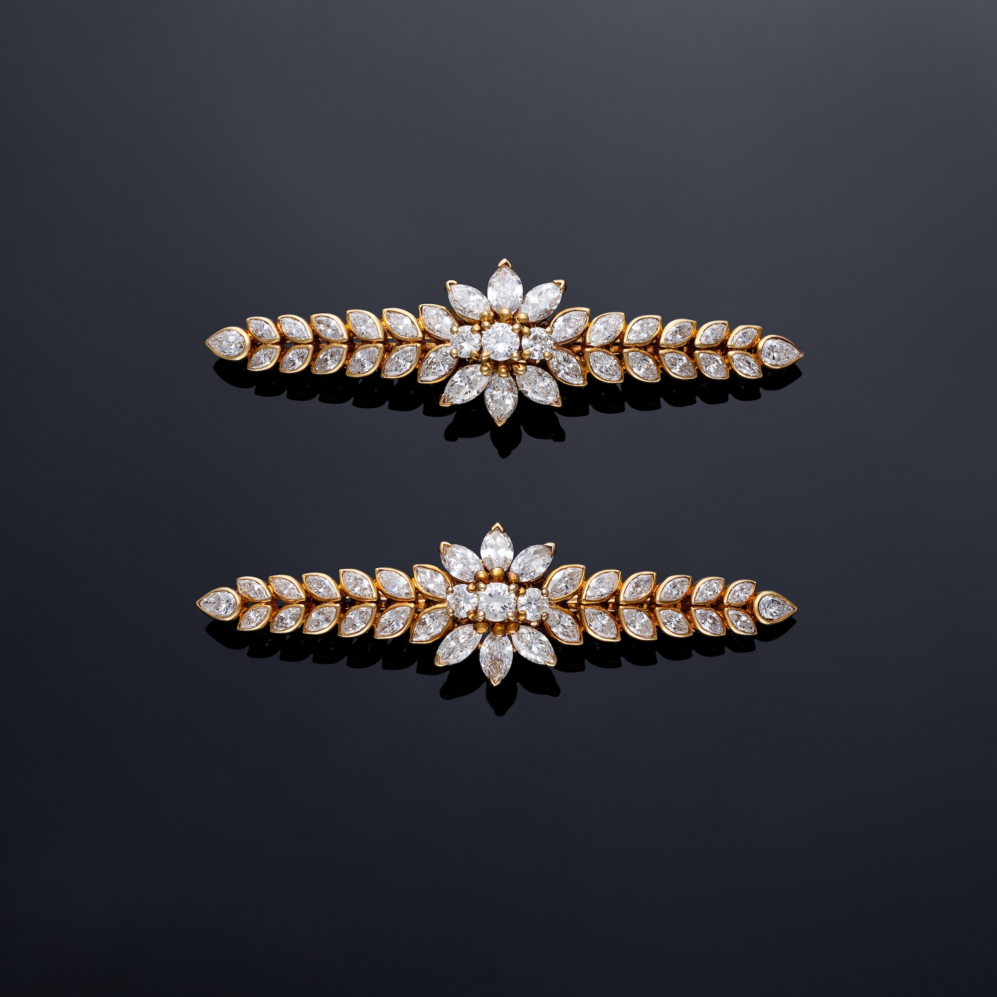 Each centering upon a diamond florette set with circular- and marquise-cut diamonds, to the collet-set marquise leaves, mounted in 18k yellow gold. Signed Cartier Paris, with French assay and maker's marks, numbered 137758 and 137759. Diamonds weighing approximately 5.5-6.0 carats in total.