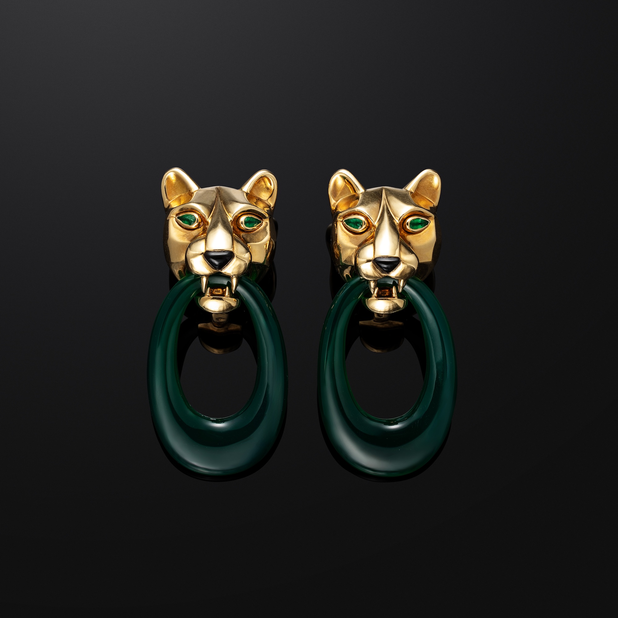 Each designed as a panther head, set with emerald eyes and onyx nose, suspending an onyx hoop, accompanied by a pair of interchangeable green chalcedony hoops, mounted in 18k yellow gold. Signed Cartier Paris, stamped 750, with French assay mark for 18k gold and maker's mark, numbered HPS466, circa 1988. Dimensions: 49 x 18 mm.