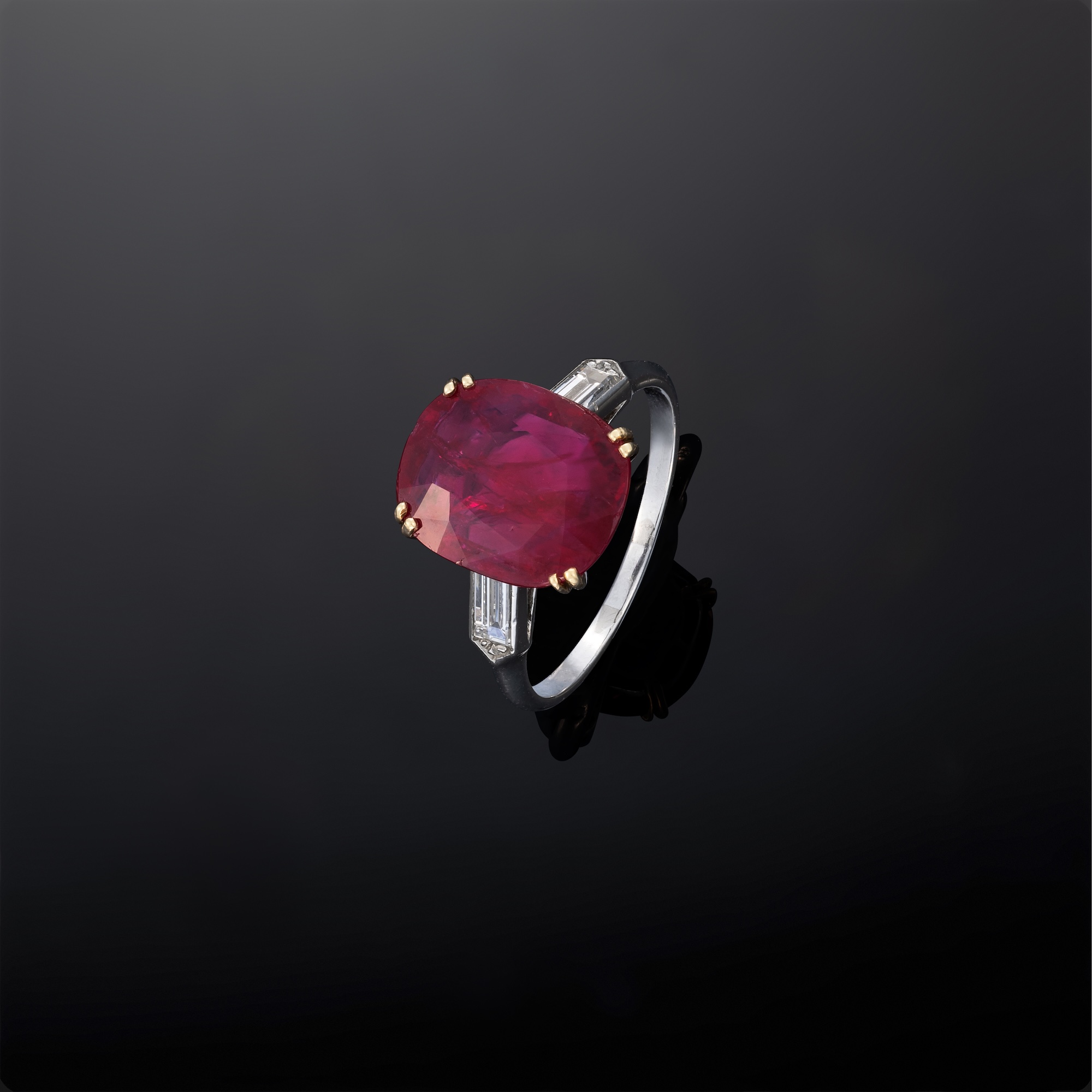 Set with a cushion-shaped ruby of 5.45 carats, flanked by diamond baguettes, mounted in platinum. With French assay mark for platinum and maker's mark for Chaumet. French ring size 55. Accompanied by GRS report no. GRS2023-128499 dated 12 December 2023 stating that the 5.45 carat ruby is of Mogok, Burmese origin and shows no indication of thermal treatment.