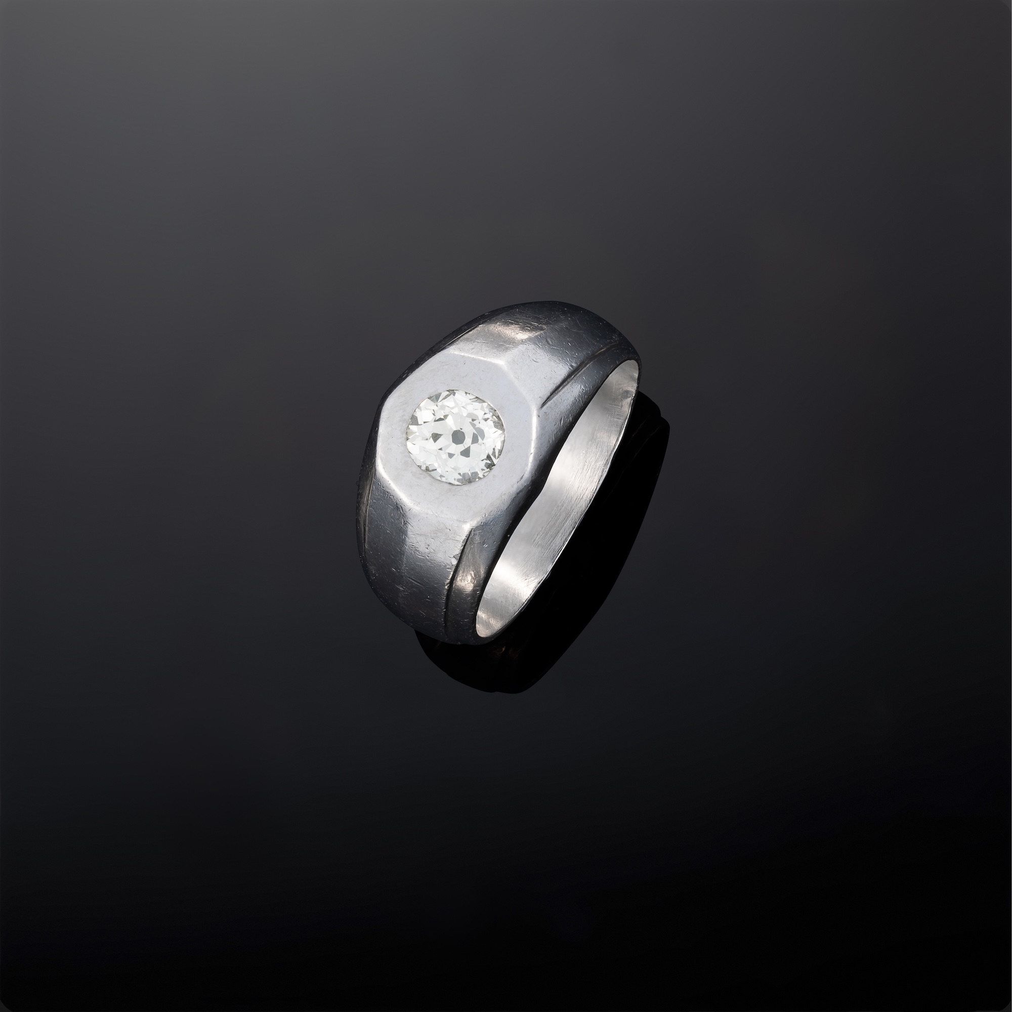 Ring mounting in a faceted design, the shank composed of 4 sculpted facets radiating from central octagon, set with an old-mine cut, circa 1932-74 made in Paris. With certificate authentication. Cape diamond measuring 16.4* 15.7 * 4.1mm. Size 8. French Assay mark for Platinum and Effaced makers mark.