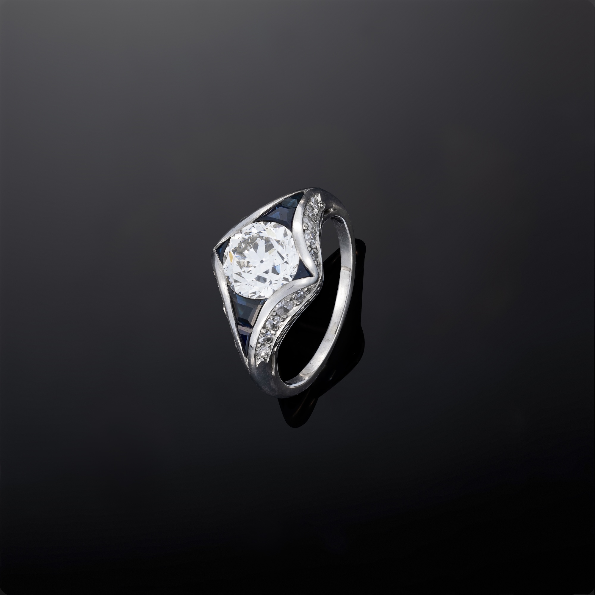 Centering a circular brilliant cut diamond weighing 1.80 carats, accented by single-cut diamonds and calibre-cut sapphires, mounted in platinum. Unsigned, with French assay mark for platinum, numbered. French ring size: 51. Accompanied by GIA report no. 2486533802, dated February 16, 2024, stating the 1.80 carat daimond is M, Faint Brown colour, SI1 clarity.
