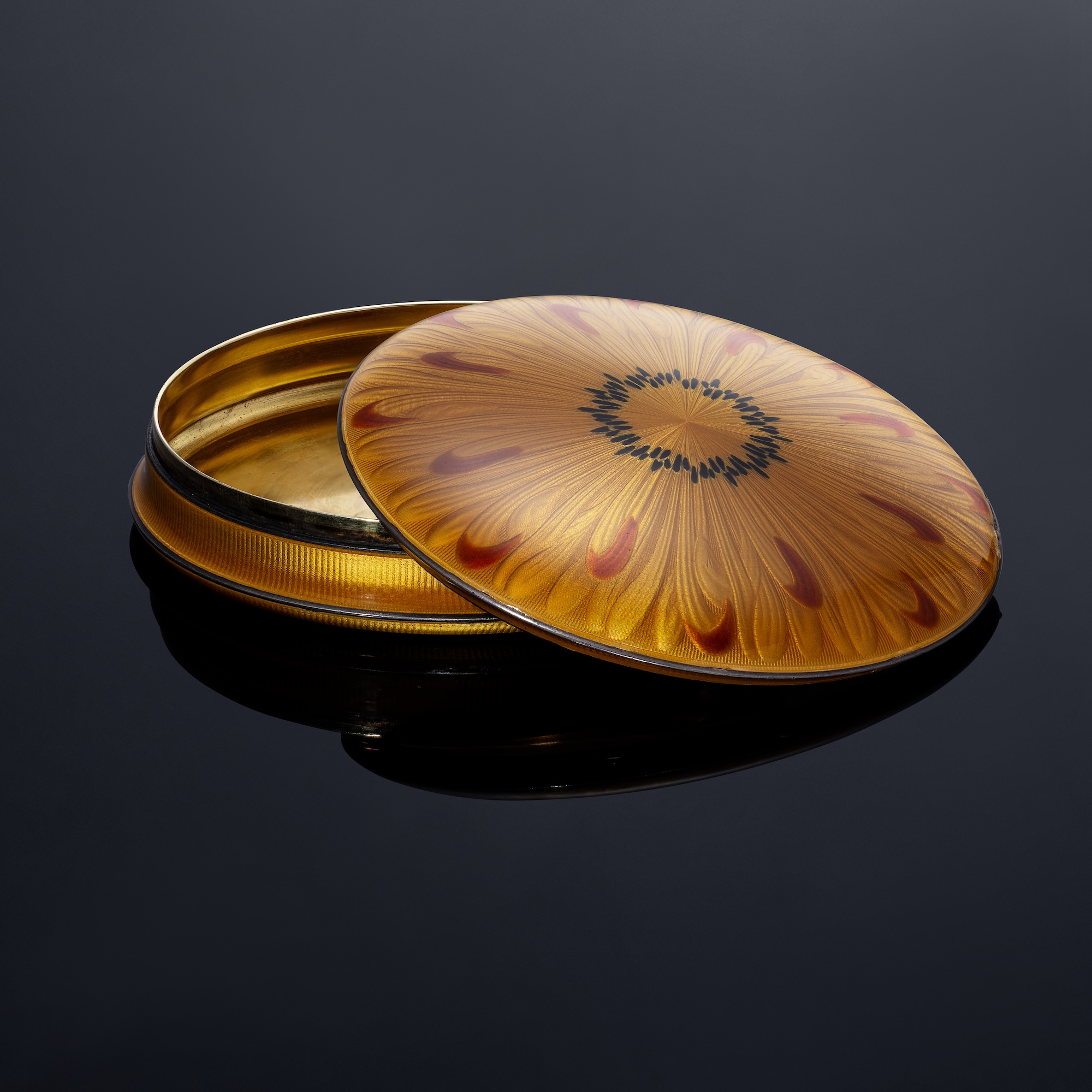 Of circular form, the lid applied with guilloché enamel depicting the pistil of a flower. Signed Tiffany & Co. Paris and Feuillâtre, with French assay marks and maker's mark for Eugéne Feuillâtre, circa 1900.