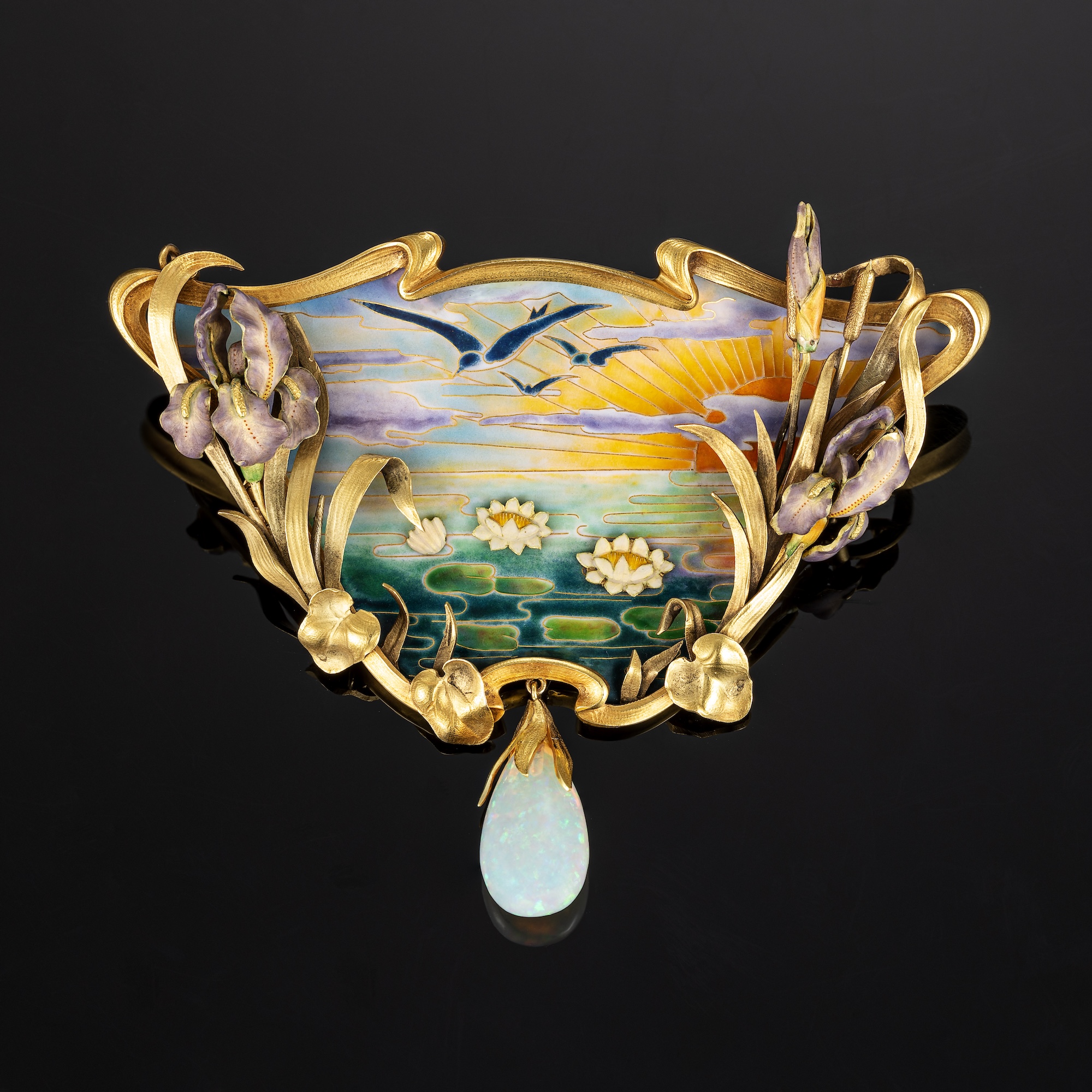 Gustave Roger Sandoz Art Noveau Enamel and Opal Brooch in 18k yellow gold, circa 1900