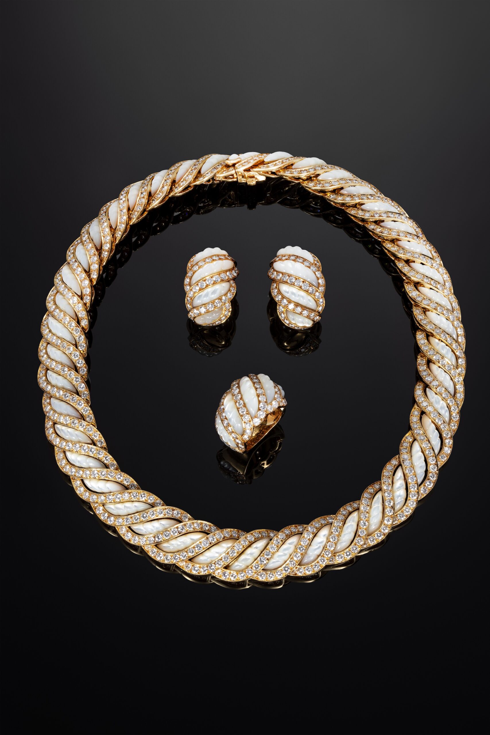 Of ropetwist design, set with fluted mother-of-pearl carvings, framed by circular-cut diamonds, mounted in 18k yellow gold.v Signed Mauboussin Paris, with French assay mark and maker's mark, numbered 47790. French ring size 52. Diamonds weighing approx. 1.5 cts in total.