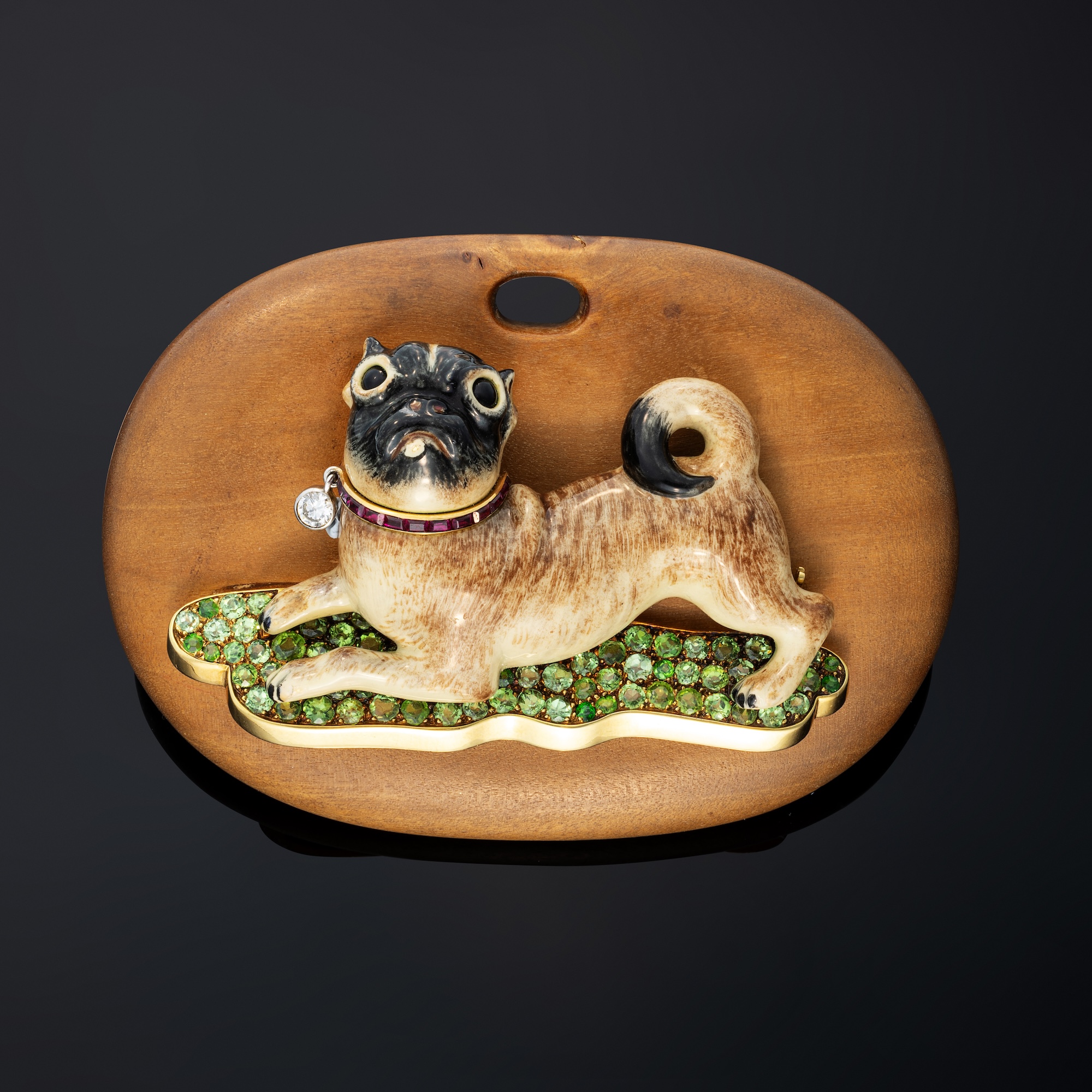 The cream enamelled pug seated on a pillow pavé-set with circular-cut peridots, the collar accented by calibre-cut rubies and circular-cut diamond, can be attached to a wooden plaque and worn as a pendant, mounted in 18k yellow gold. Unsigned, with French maker’s assay marks for 18k gold and maker’s marks for Robert Davière. Dimensions: approx. 62 x 38 mm. Accompanied by a copy of Francoise Cailles Letter of Expertise, dated 11 October 2018, stating that the jewel was created circa 1954 after a drawing by Juliette Moutard by René Boivin. Literature Cf.: Françoise Cailles, Rene Boivin Joaillier, 1994, pg. 300, for an illustration of an identical brooch.