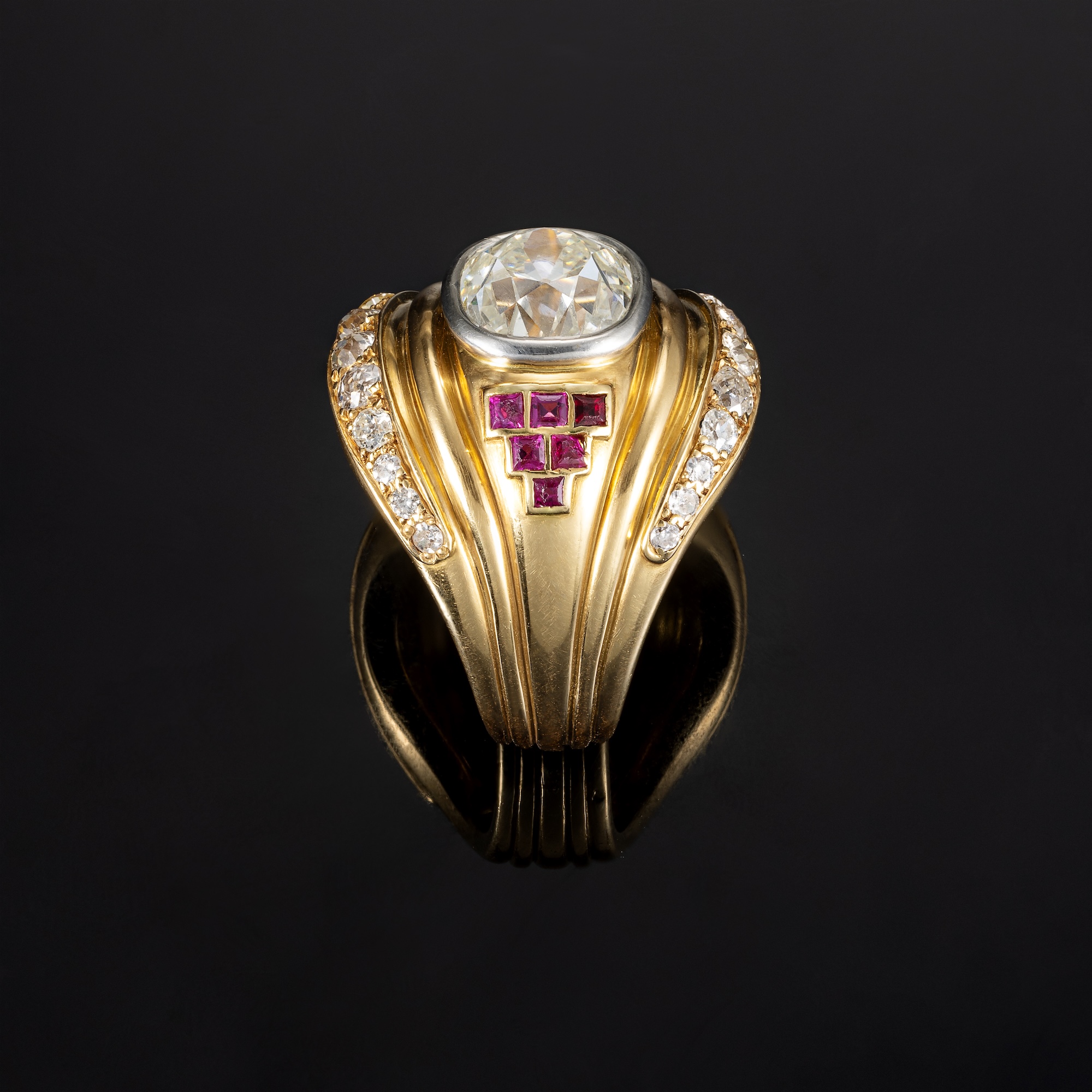 Centering on an old-mine cut diamond stated to weigh 6.45 carats, flanked by geometrical ruby motifs, outlined by circular-cut diamonds, in a fluted taper mount in 18k yellow gold. Unsigned, with French assay mark and partially indistincted maker's mark, circa 1943. Accompanied by Suzanne Belperron certificate of authenticity. French ring size 60.