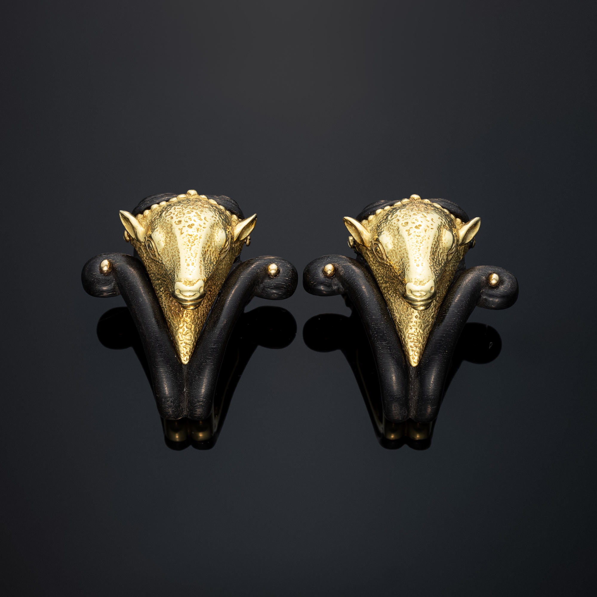 Comprising a hinged bangle, a ring and a pair of earrings, each depicting a textured gold ram head, the bangle set with horn-sculpted horns, the ring and earrings set with ebony-sculpted horns, mounted in 18k yellow gold. Bangle signed Van Cleef & Arpels, inscribed 750, numbered 12560B. Ring signed VCA and stamped OR750. Earrings unsigned with import gold mark.